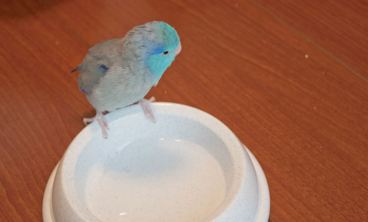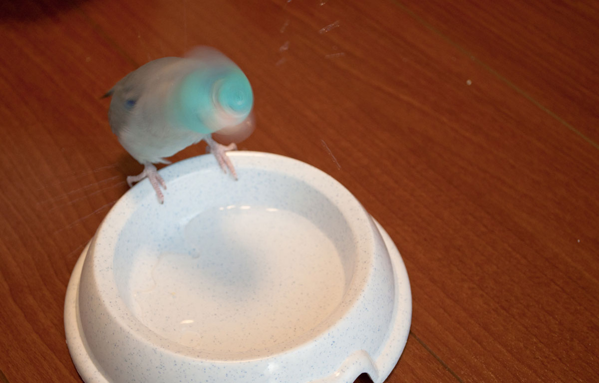 水につかって水浴びすることはないので、犬用の餌入れ(犬は飼ってません。そらちゃん専用です。)に薄く水をはっています。